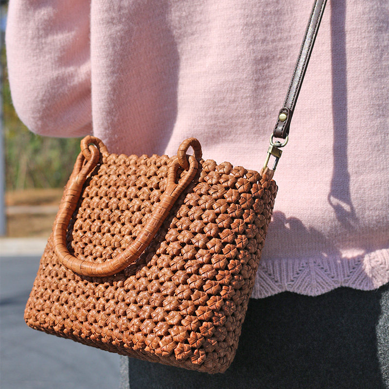 職人が一つ一つ手編みで仕上げた丁寧な作りが、バッグ全体の品質を高めています。