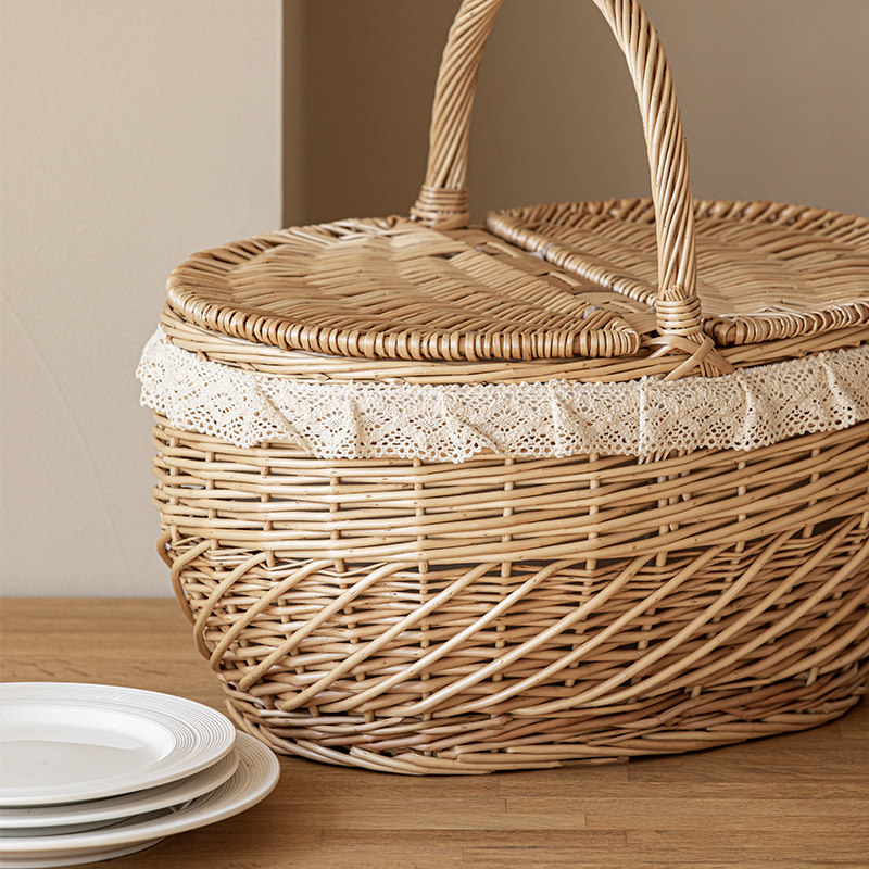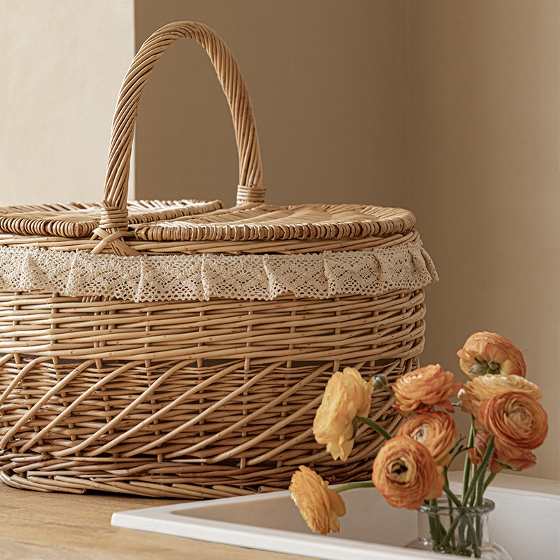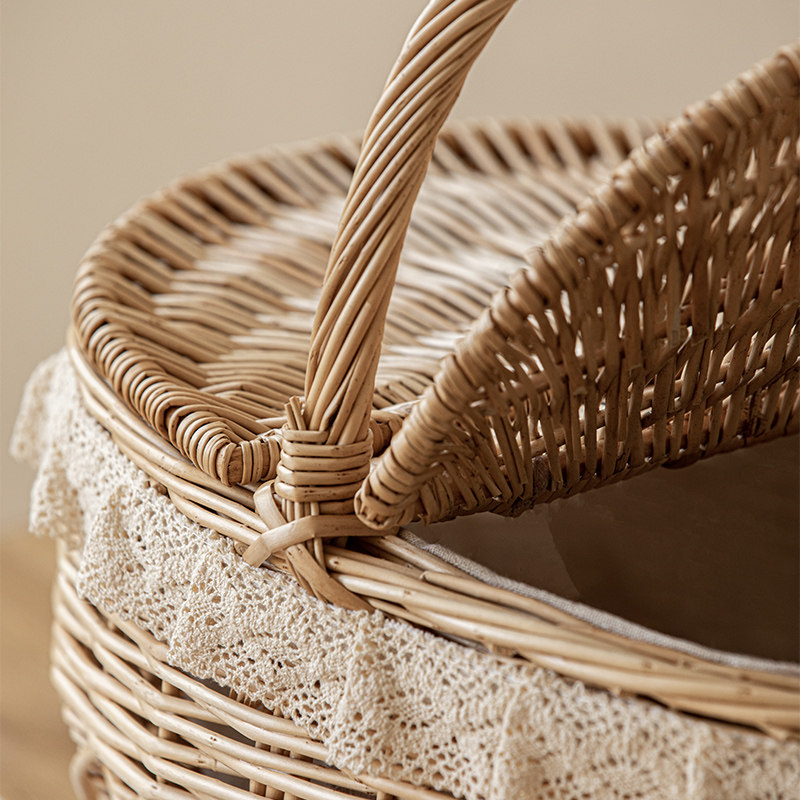 繊細なレース装飾が施された上品なカゴバッグです。 楕円形の丸みを帯びたフォルムと蓋付きのデザインで、中身をしっかり守りながらおしゃれに持ち歩けます。 ハンドバッグ型の持ち手は編み込みが美しく、手に馴染む優しい質感が魅力です。 ピクニックやお出かけはもちろん、インテリア収納としても活躍する実用性の高いアイテムです。 ナチュラルな籐編みの風合いが、どんなスタイルにも自然に調和します。
