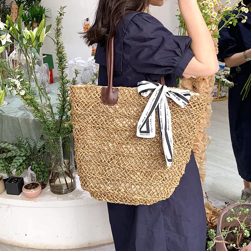 合成皮革の持ち手と愛らしいスカーフリボンがアクセントとなり、カジュアルながら上品な印象を演出します。