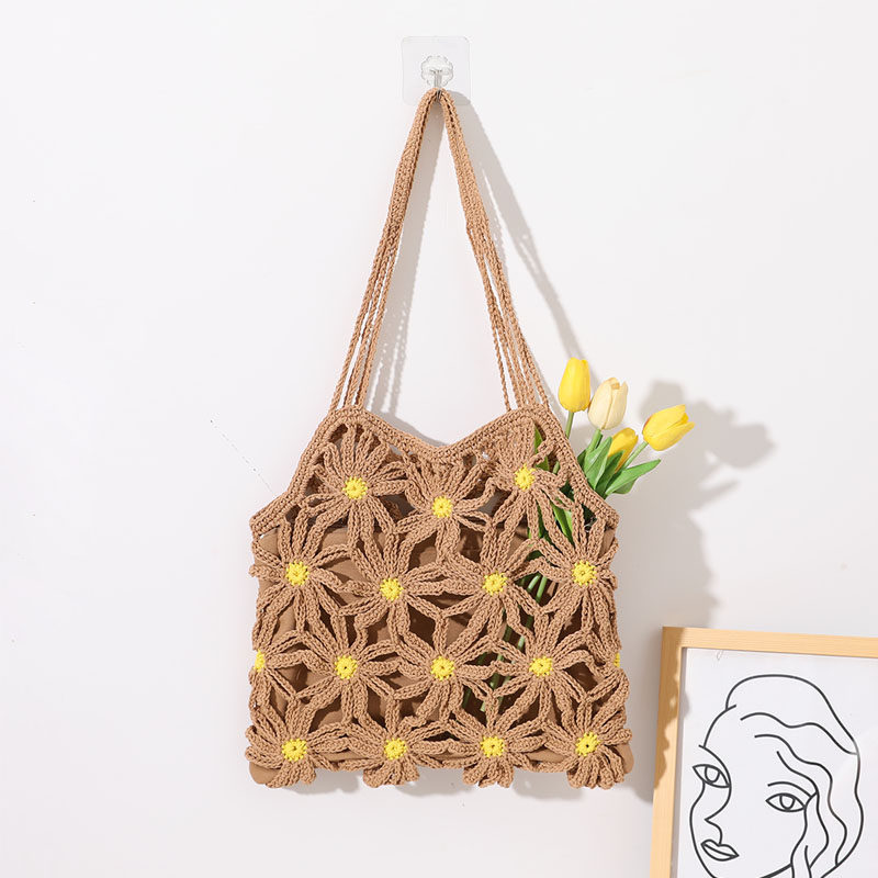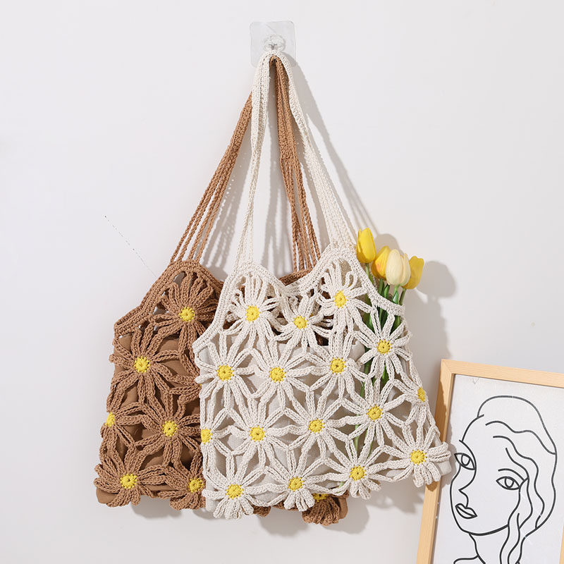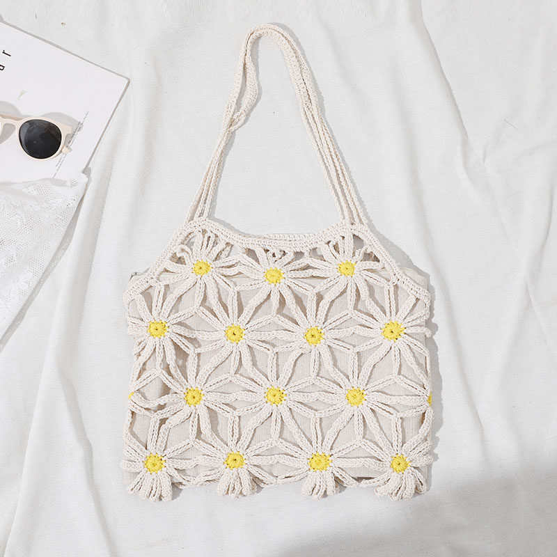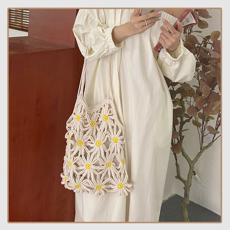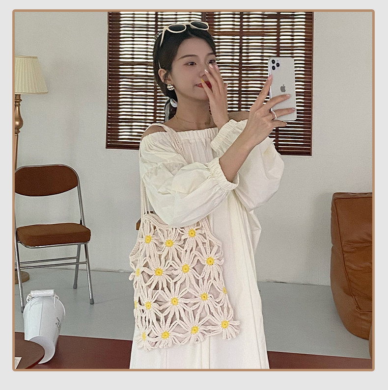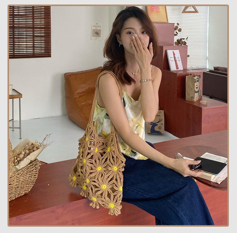 大きな花モチーフを丁寧に編み込んだショルダー型のカゴバッグです。