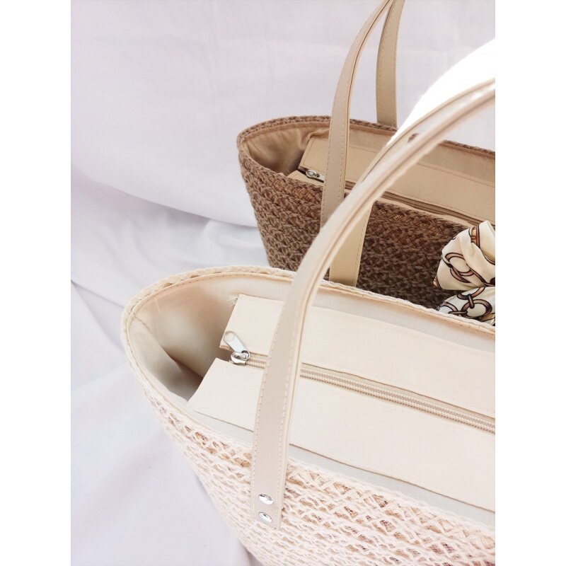 ナチュラルな風合いが魅力的なカゴバッグのトート型です。 丁寧に編み込まれた本体に、しっかりとした持ち手が付いており、日常使いに最適なサイズ感となっています。 取り外し可能なスカーフがアクセントになり、気分に合わせてアレンジを楽しめます。 軽量で通気性も良く、お買い物やお出かけなど幅広いシーンで活躍する便利なアイテムです。 シンプルで飽きのこないデザインが、どんな装いにも馴染みます。