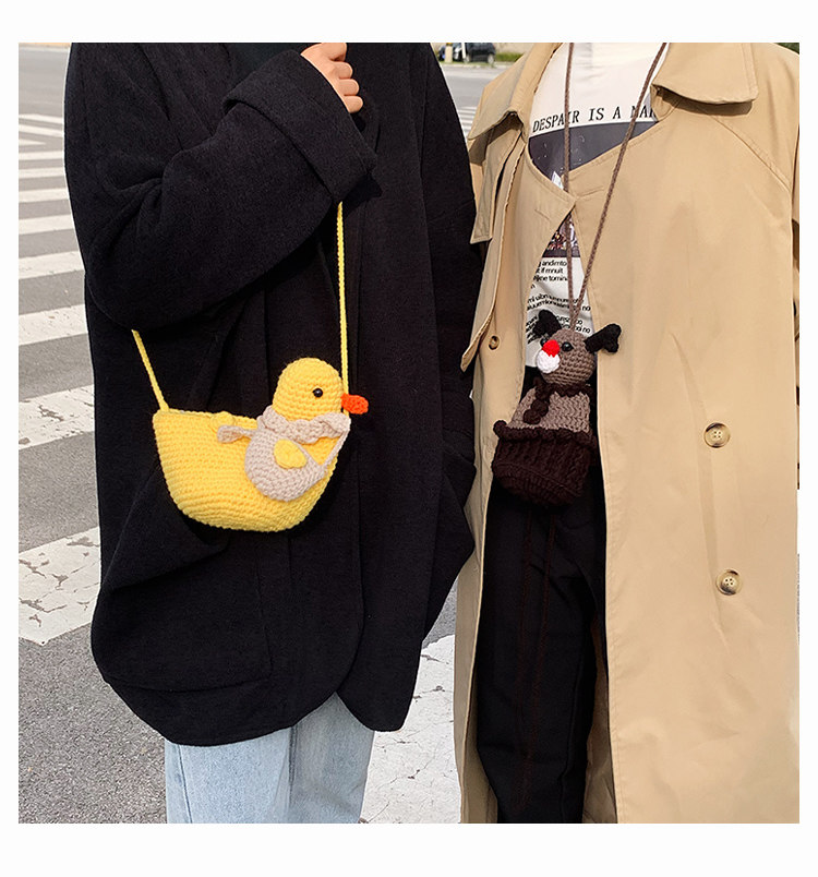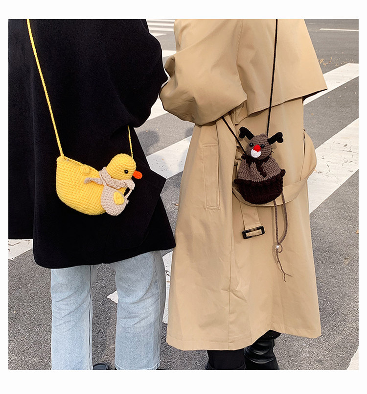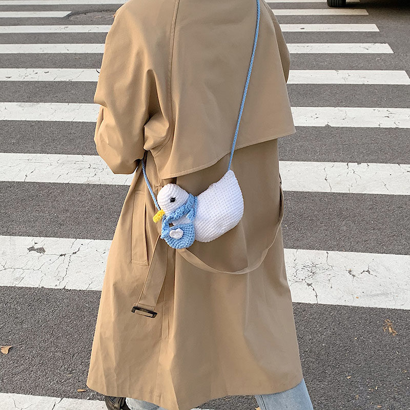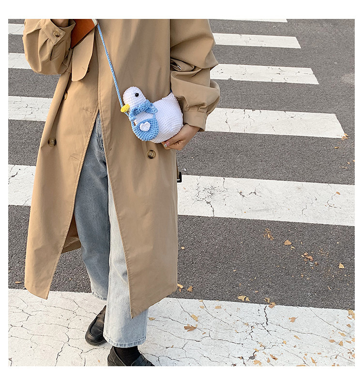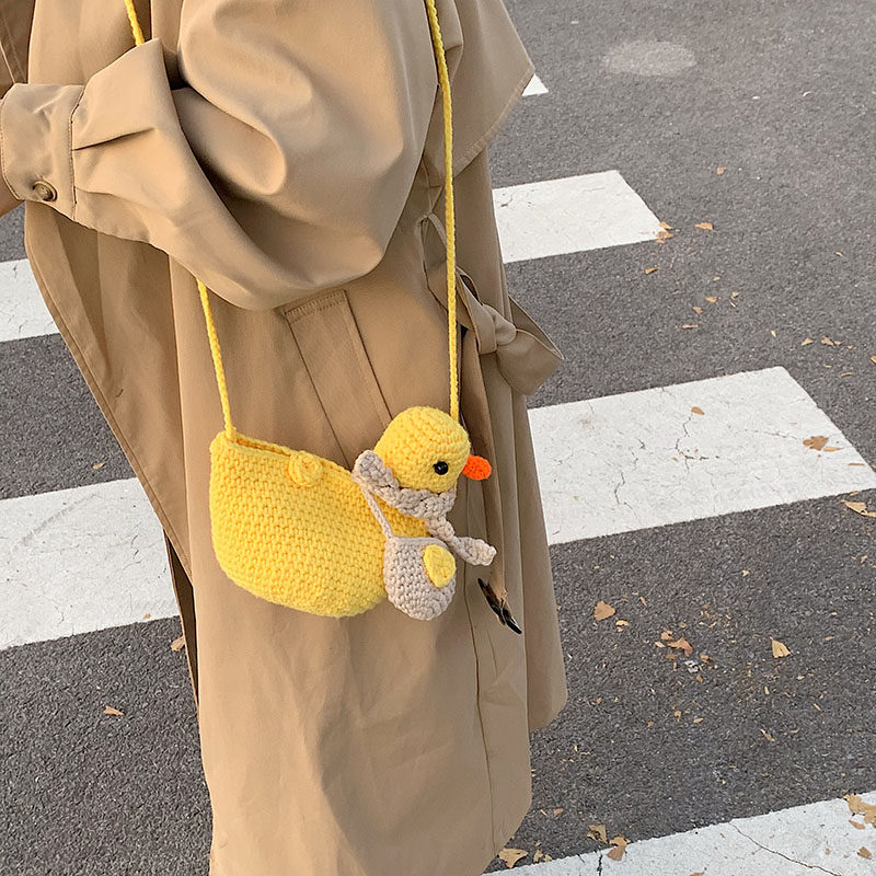 温かみのある手編みの風合いが魅力で、あひるの表情やフォルムが個性的なデザインです。