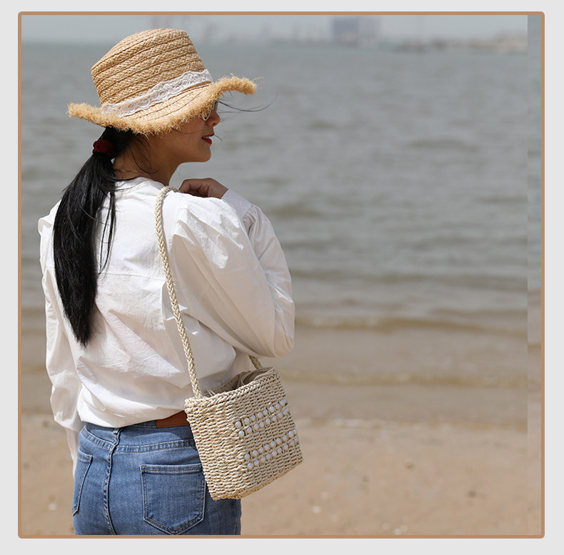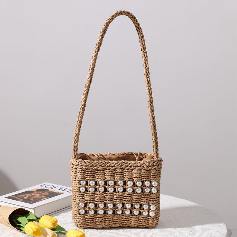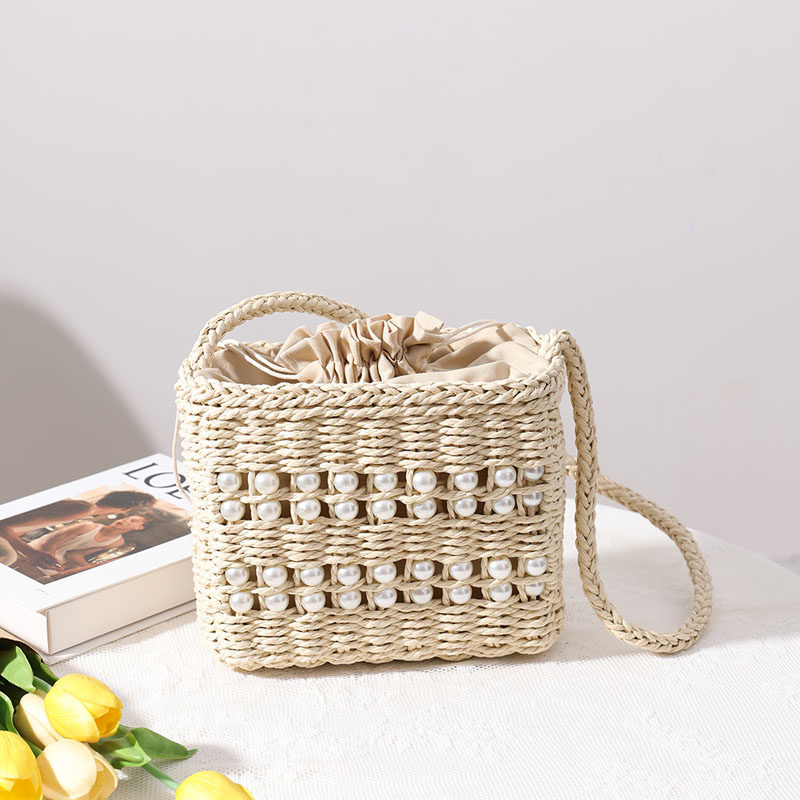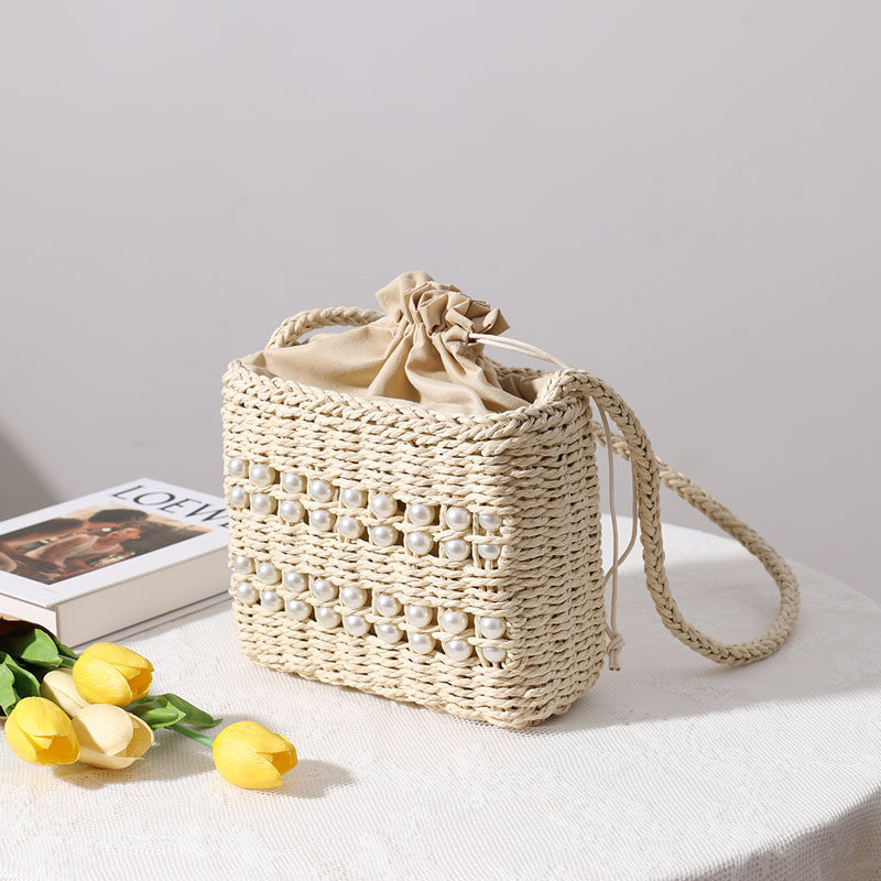 丁寧に編み込まれた天然素材の本体に、二列のパールが華やかなアクセントを添えています。
