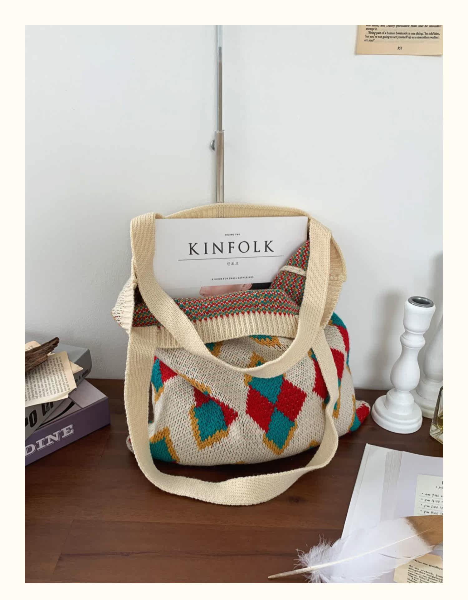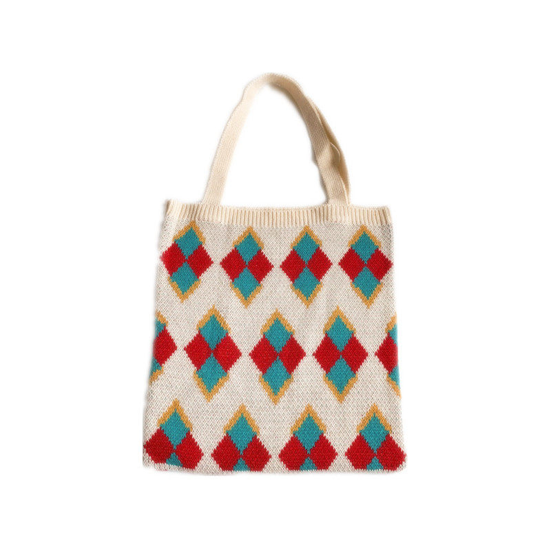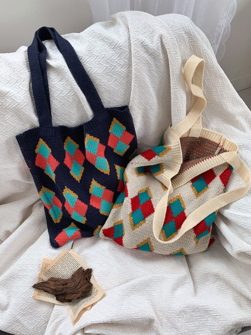 丁寧に編み込まれた菱形の幾何学模様が、レトロで温かみのある雰囲気を演出します。