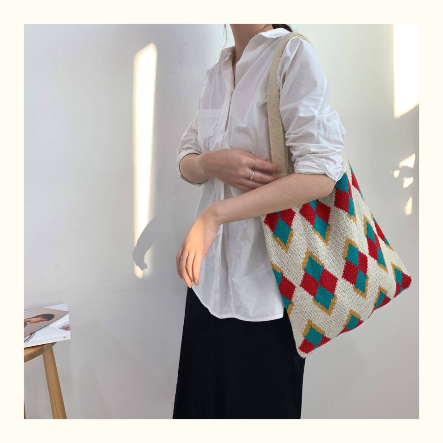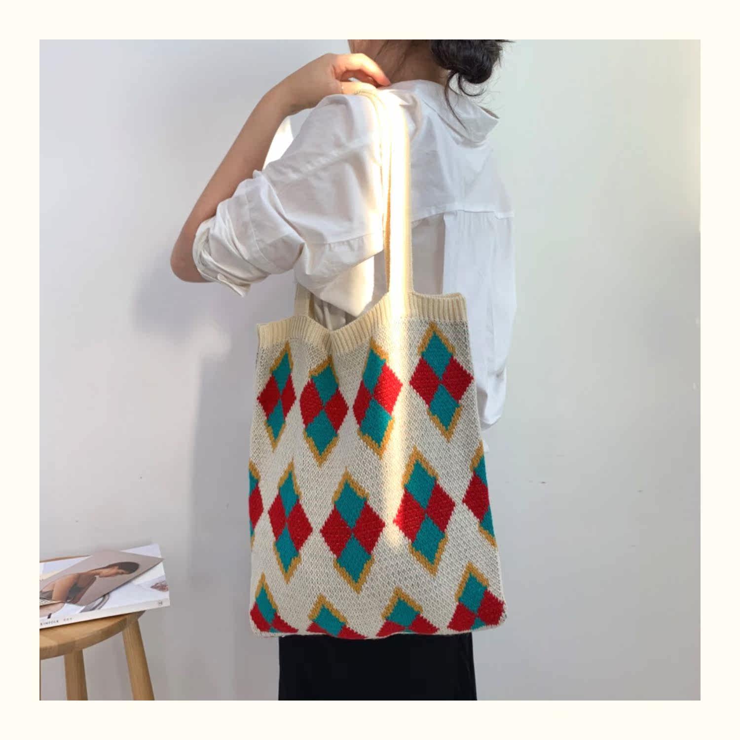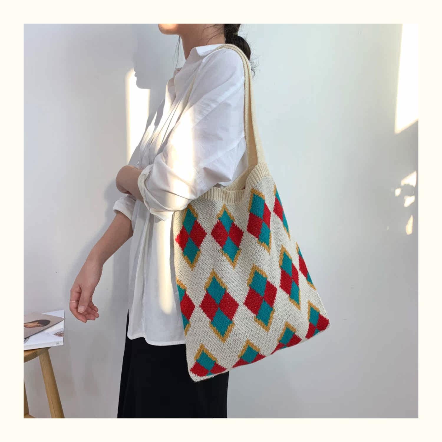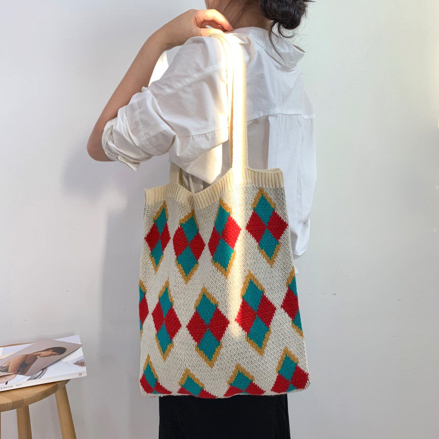 鮮やかなアーガイル柄が目を引くトート型のカゴバッグです。 丁寧に編み込まれた菱形の幾何学模様が、レトロで温かみのある雰囲気を演出します。 肩掛けできる長めの持ち手で、デイリー使いにぴったりの収納力も魅力です。 カジュアルな装いに個性的なアクセントを添える、春夏のお出かけに最適なアイテムです。 軽量で使いやすく、普段使いから旅行まで幅広いシーンで活躍します。