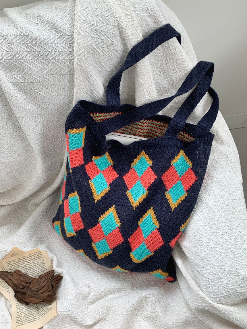 鮮やかなアーガイル柄が目を引くトート型のカゴバッグです。