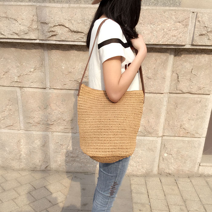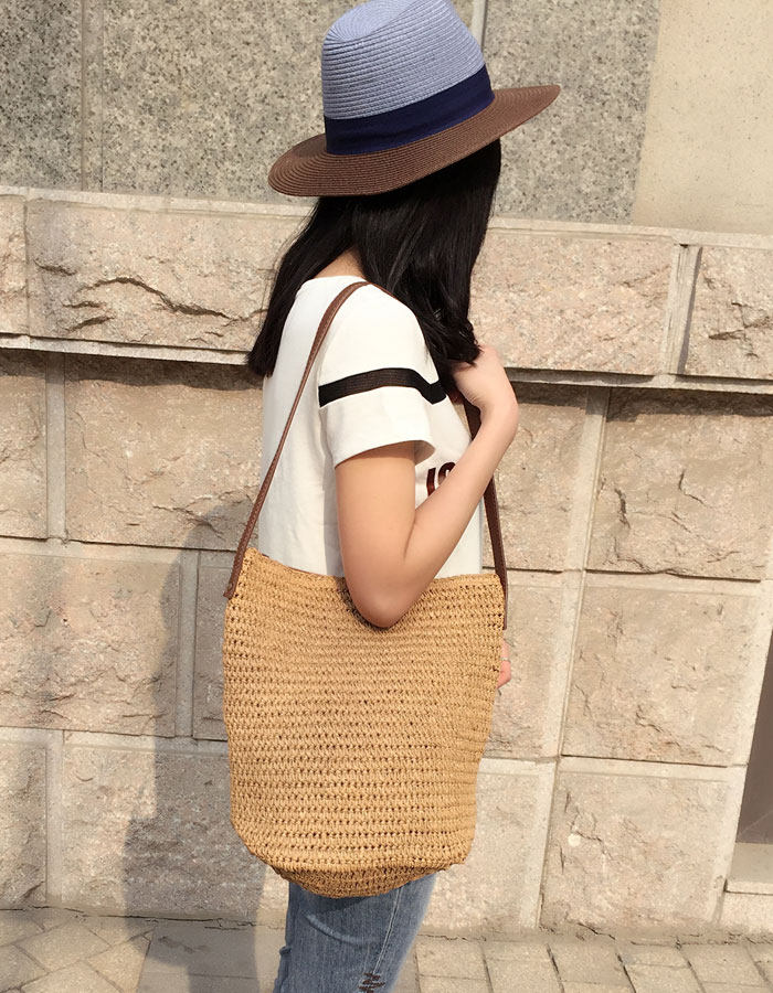 丁寧な編み込みが美しいショルダー型のカゴバッグです。 バケツ型のシルエットが可愛らしく、たっぷりとした収納力も魅力的です。 調節可能な長めのストラップで斜め掛けもでき、両手が自由に使えて便利です。 ナチュラルな素材感が夏のカジュアルスタイルにぴったりで、お出かけやお買い物など様々なシーンで活躍します。 軽量で持ち運びやすく、デイリーユースに最適なアイテムです。