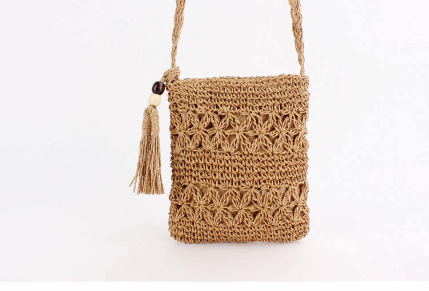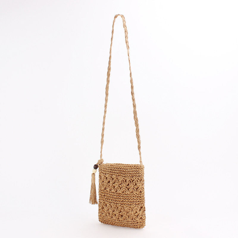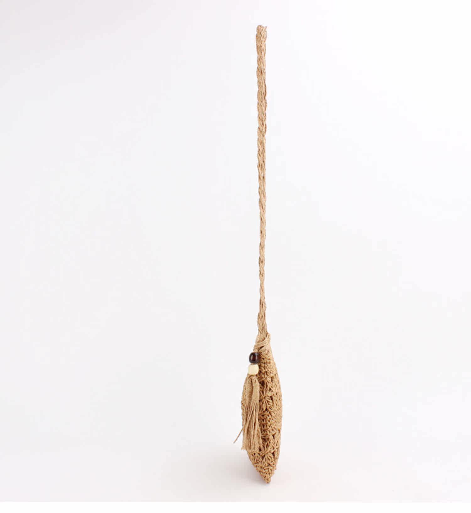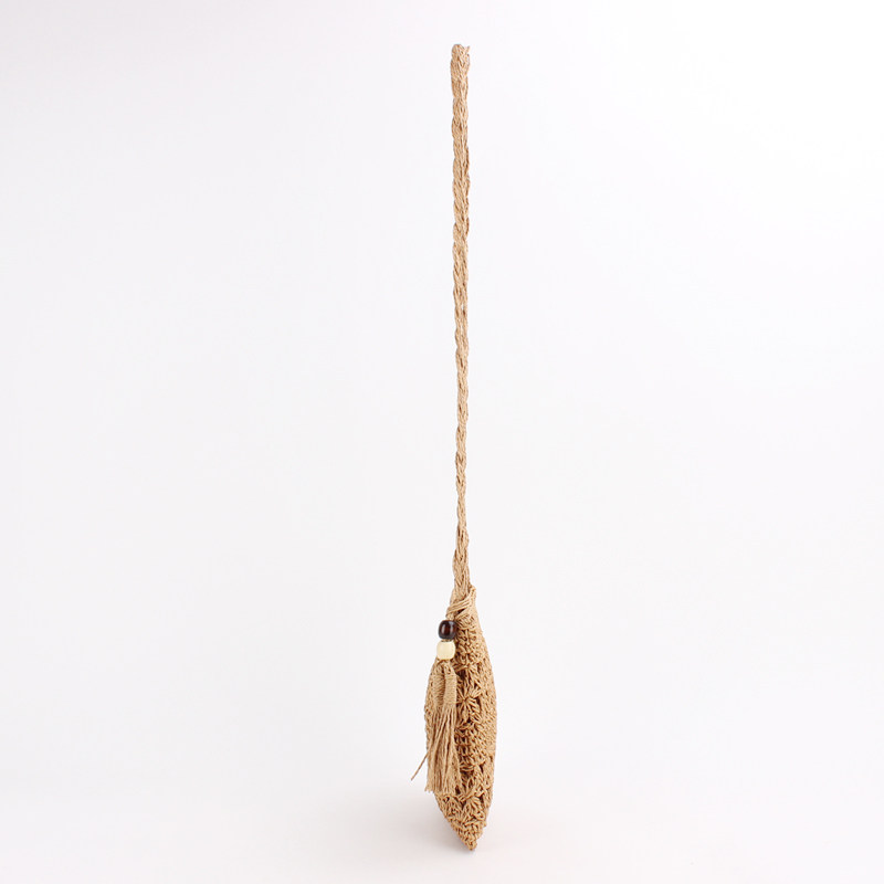 繊細な透かし編み模様が美しいショルダー型のカゴバッグです。 軽量で持ち運びやすいコンパクトなサイズ感ながら、スマートフォンやお財布などの必需品はしっかり収納できます。 編み込まれた天然素材の風合いと、サイドに揺れるタッセルがアクセントになり、夏のお出かけやリゾートシーンにぴったりです。 斜め掛けできる長めのショルダー紐で両手が自由に使え、カジュアルから上品なスタイルまで幅広く活躍します。