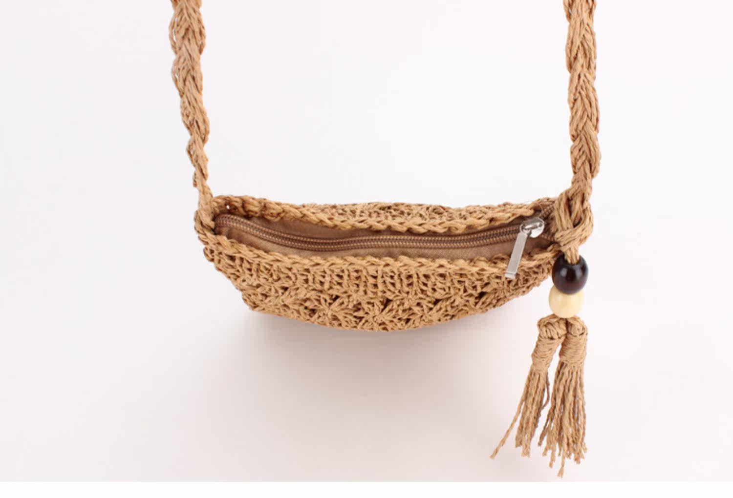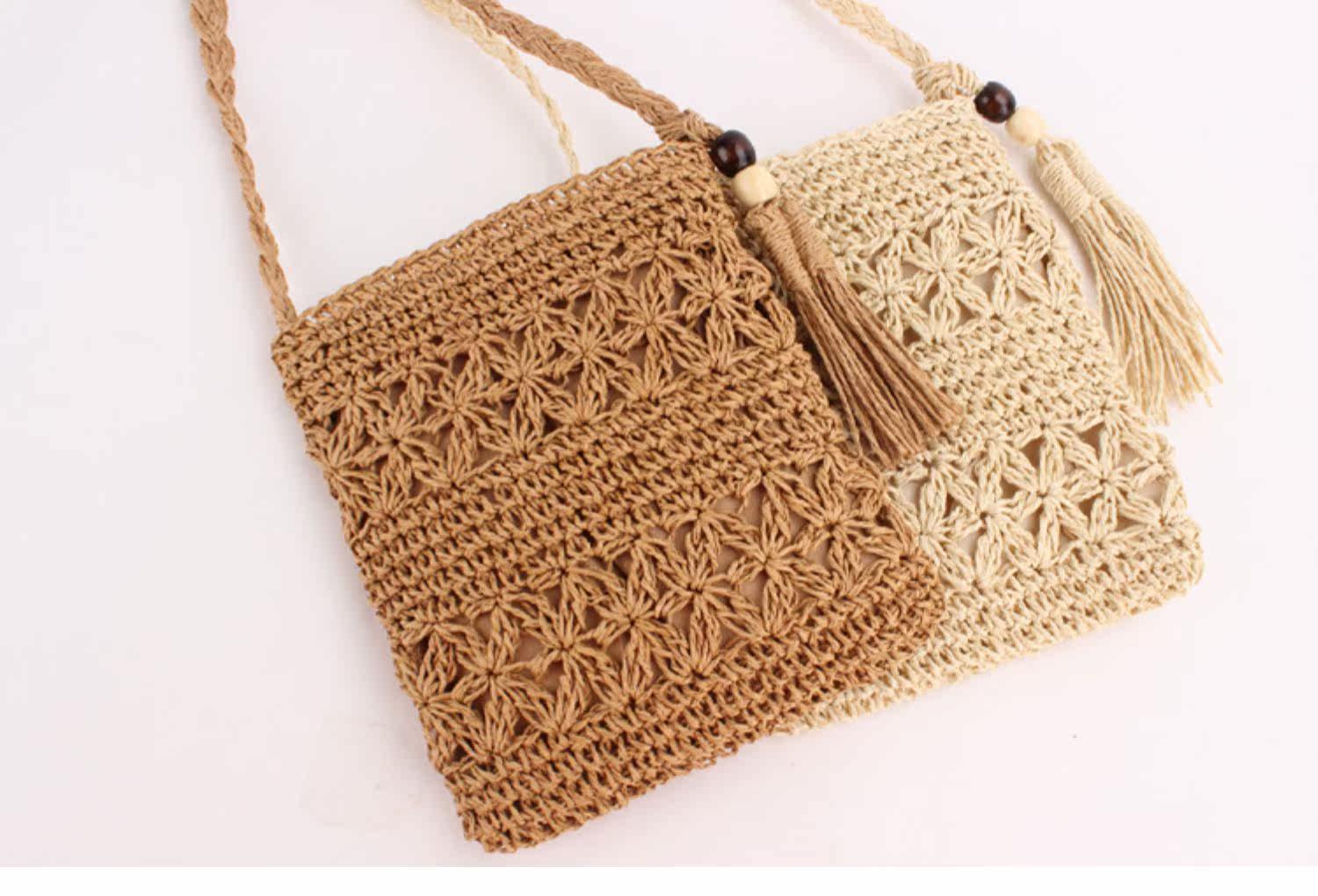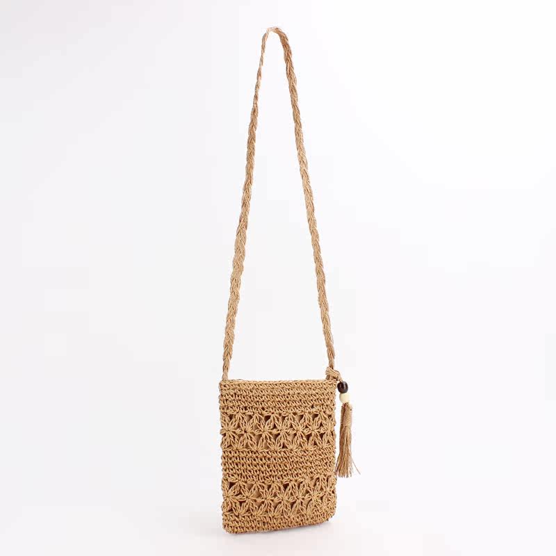 繊細な透かし編み模様が美しいショルダー型のカゴバッグです。 軽量で持ち運びやすいコンパクトなサイズ感ながら、スマートフォンやお財布などの必需品はしっかり収納できます。 編み込まれた天然素材の風合いと、サイドに揺れるタッセルがアクセントになり、夏のお出かけやリゾートシーンにぴったりです。 斜め掛けできる長めのショルダー紐で両手が自由に使え、カジュアルから上品なスタイルまで幅広く活躍します。