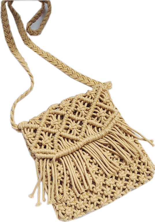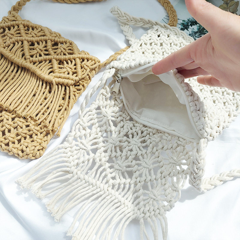 編み込まれた花モチーフとフリンジ飾りがリゾート感を演出し、夏のお出かけにぴったりです。