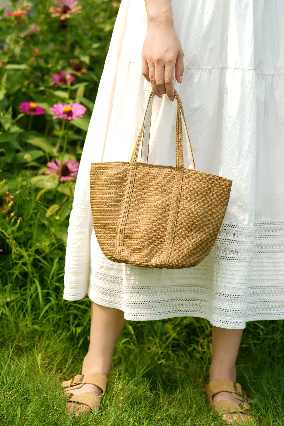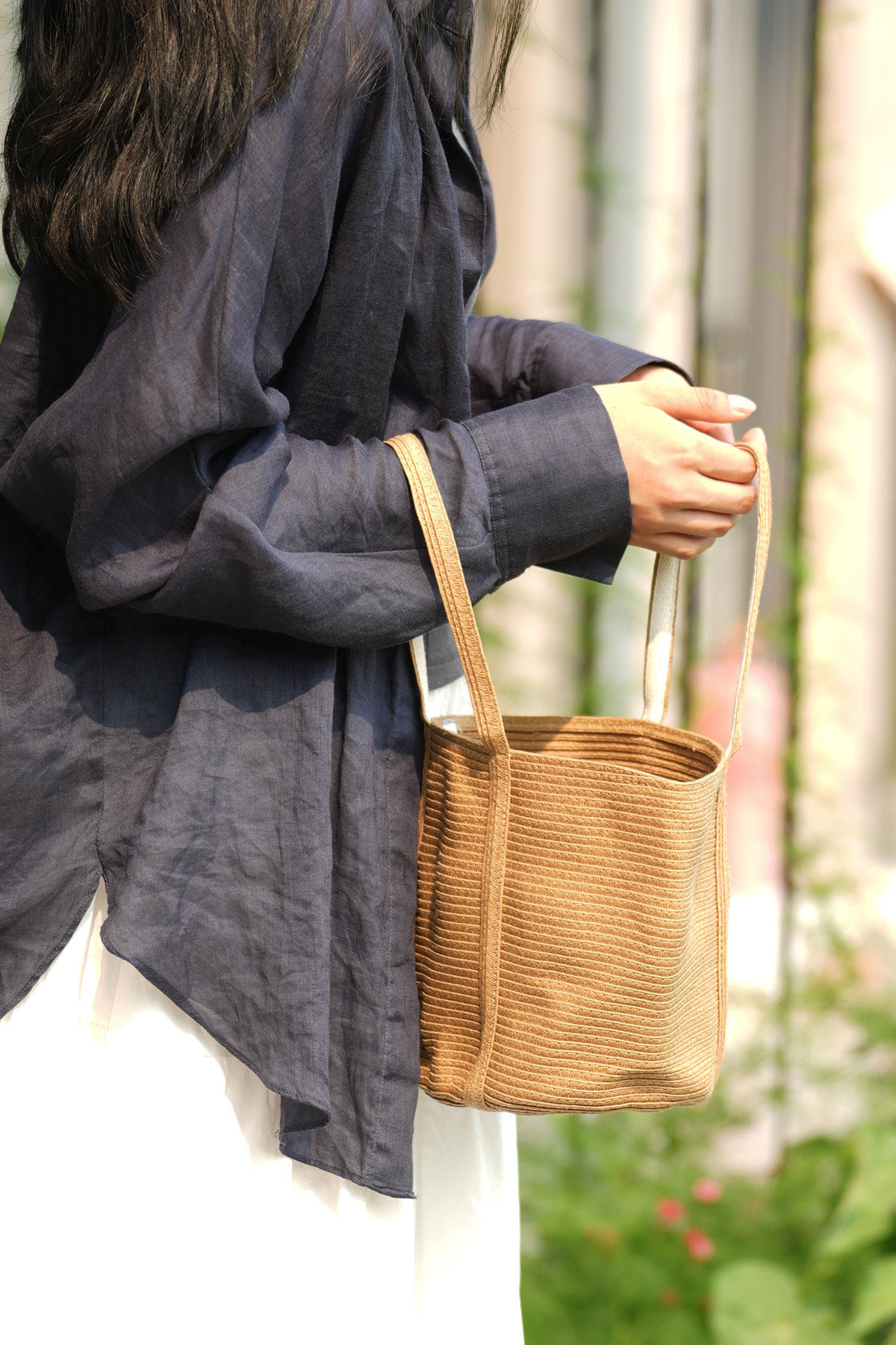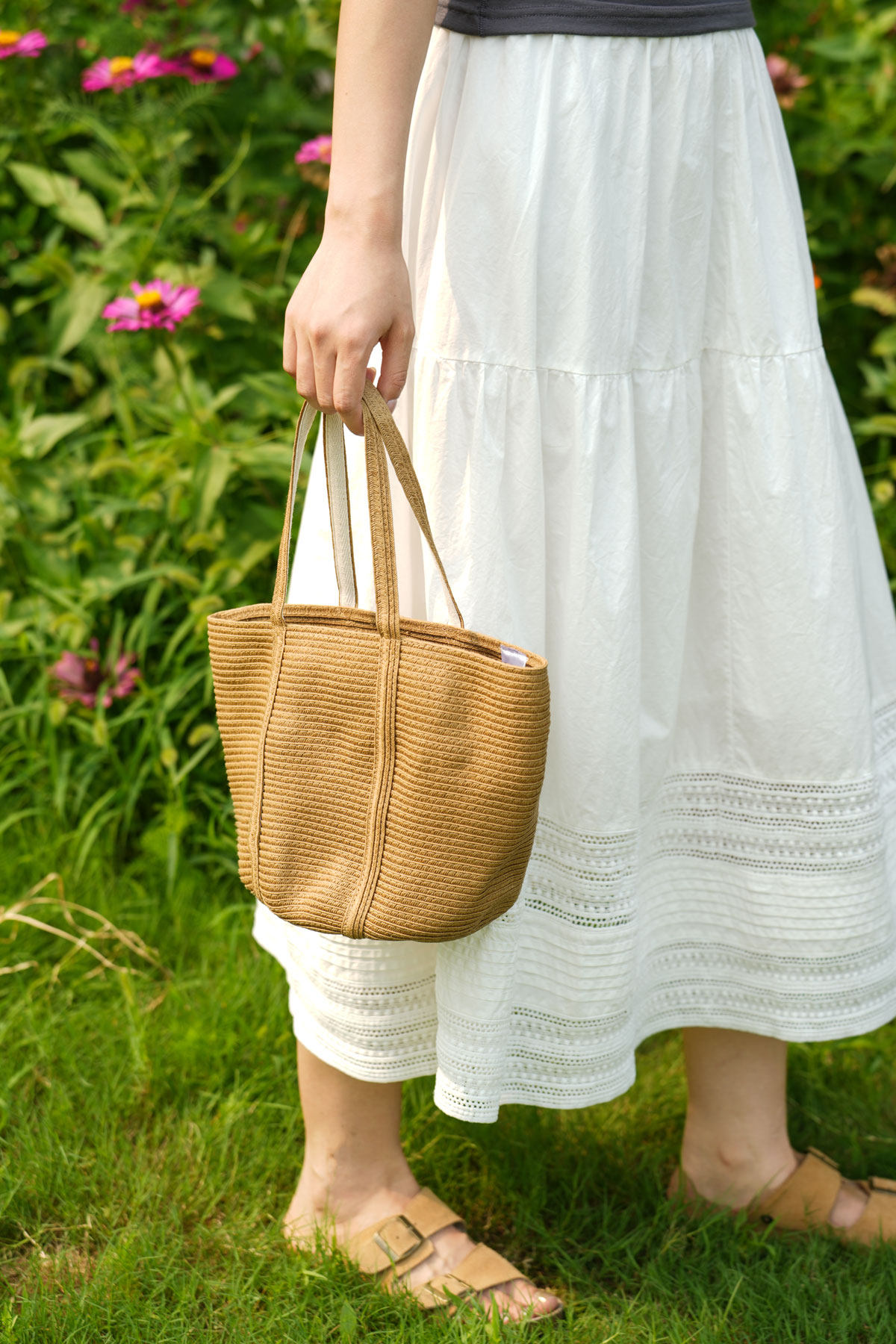 ナチュラルな風合いが魅力的な横編みデザインのカゴバッグです。