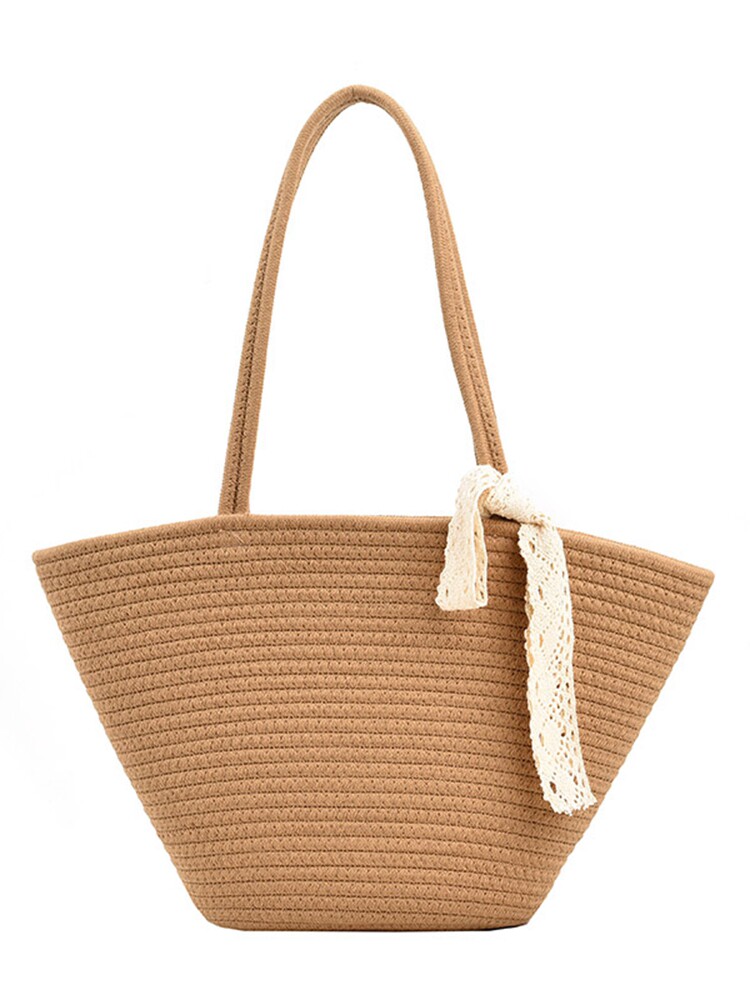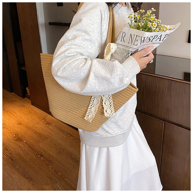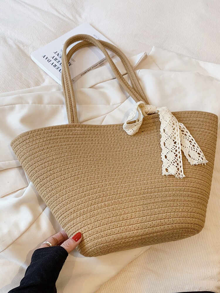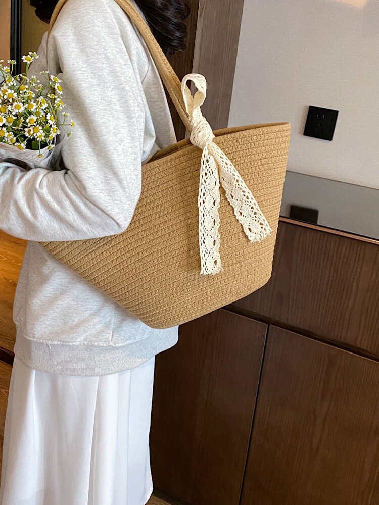 繊細なレース編みのリボンがアクセントになったトート型のカゴバッグです。