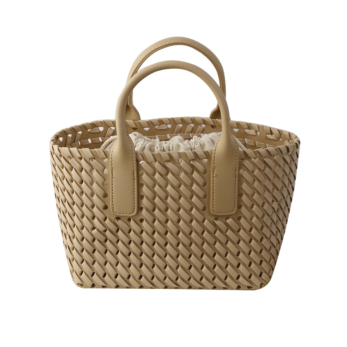 上質な編み込みデザインが美しいトート型のカゴバッグです。 レザー調の素材を丁寧に編み上げた本体に、しっかりとした持ち手が付いた実用的なデザインが魅力です。 内側にはフリル状の巾着が付いており、中身をしっかり守ります。 普段使いから休日のお出かけまで幅広く活躍する、大人の女性にぴったりの逸品です。 収納力も抜群で、デイリーユースに最適なカゴバッグとなっています。