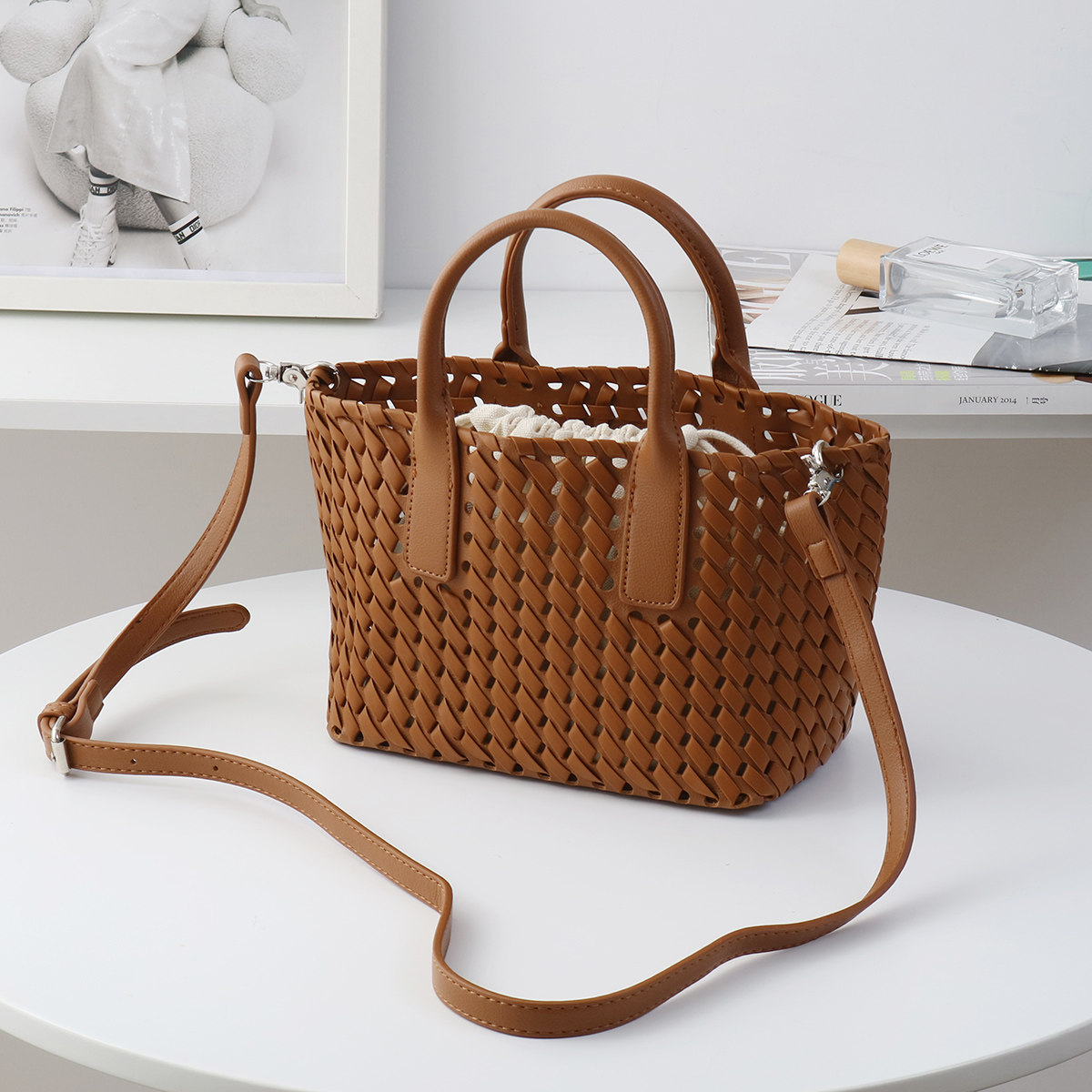 レザー調の素材を丁寧に編み上げた本体に、しっかりとした持ち手が付いた実用的なデザインが魅力です。