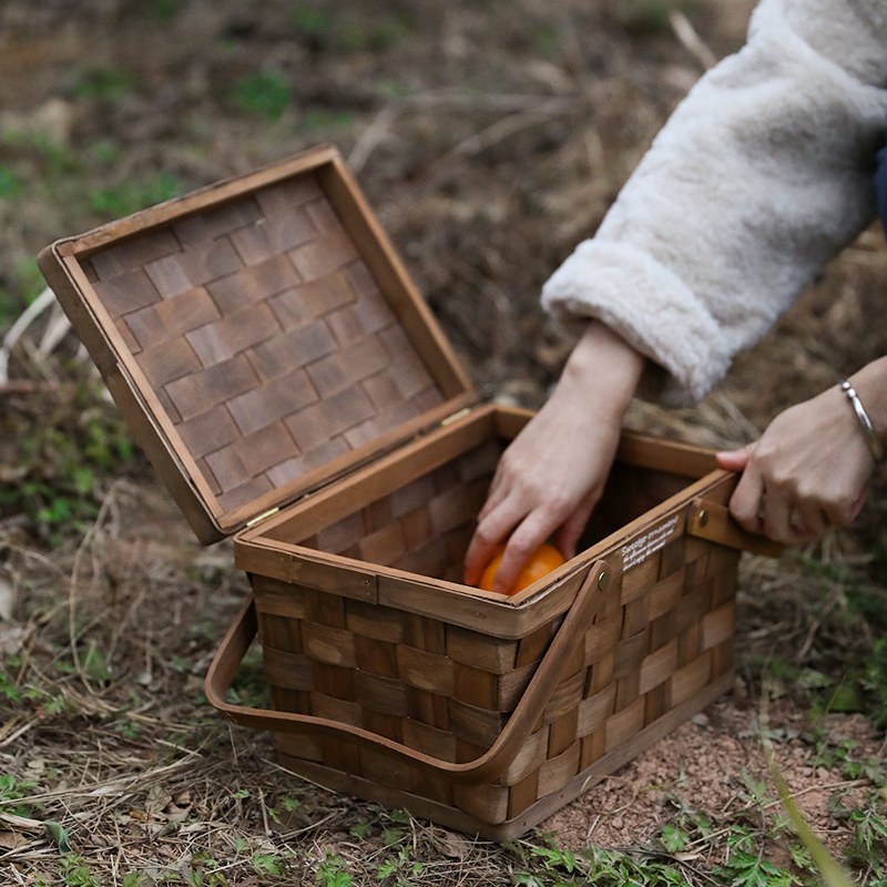 天然木材を丁寧に編み上げた温もりある仕上がりで、しっかりとした蓋と金具が大切な荷物を守ります。
