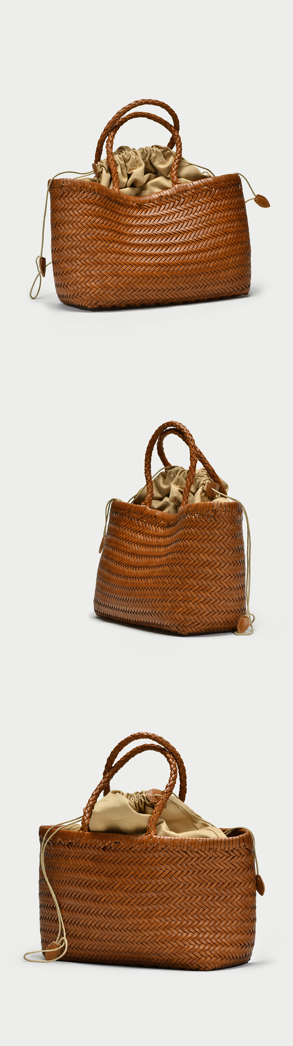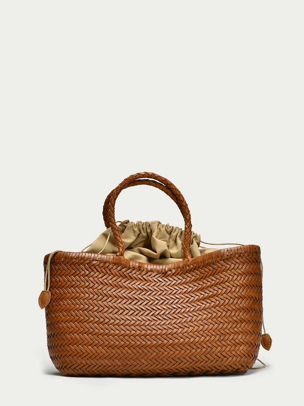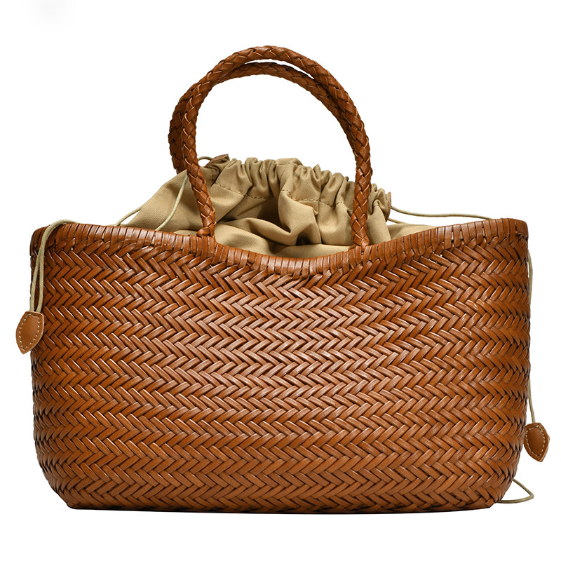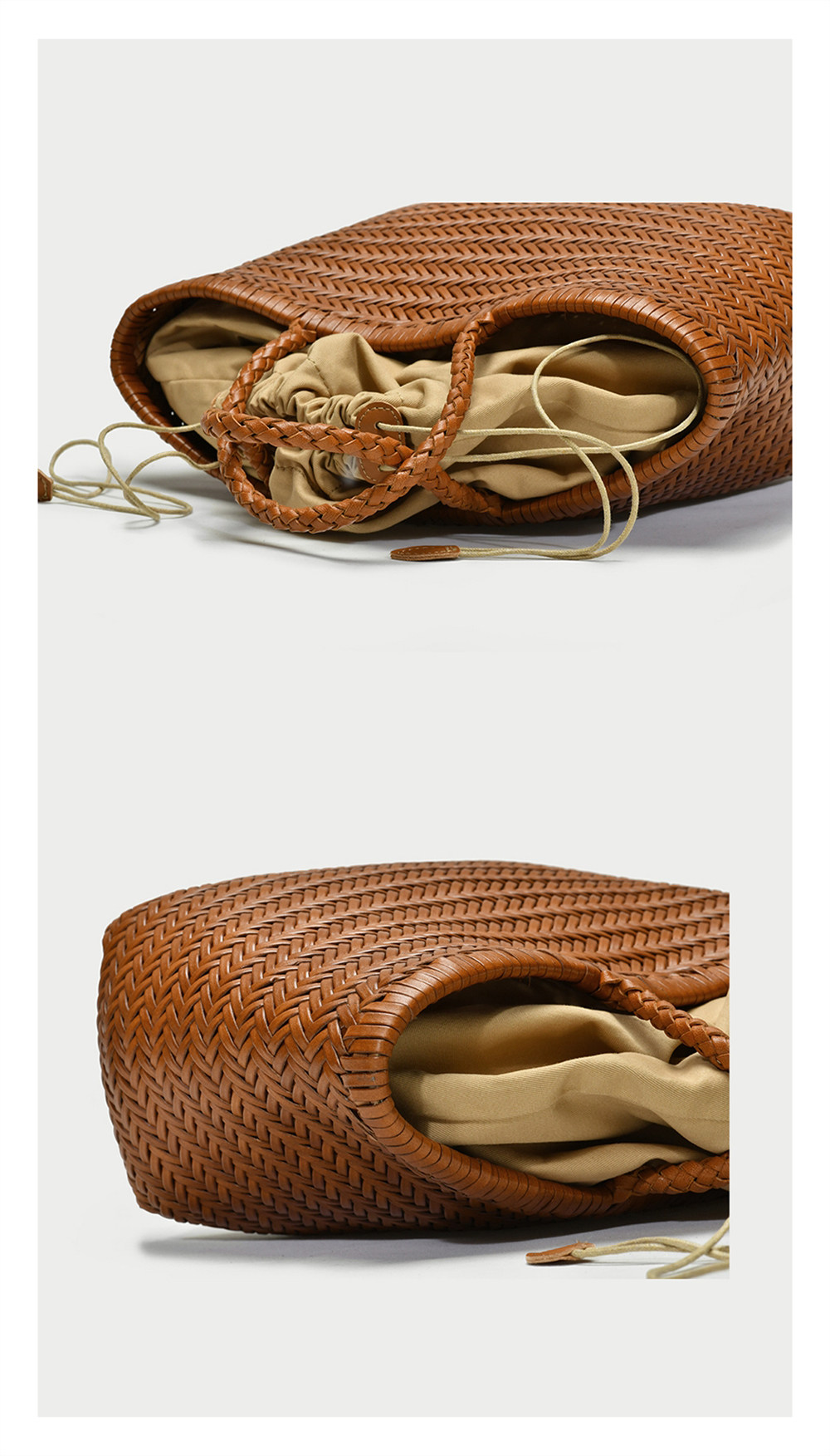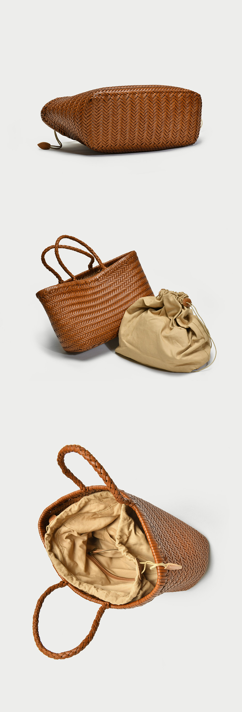 丁寧に編み込まれたレザー素材が高級感を演出し、内側の巾着が大切な荷物をしっかり守ります。