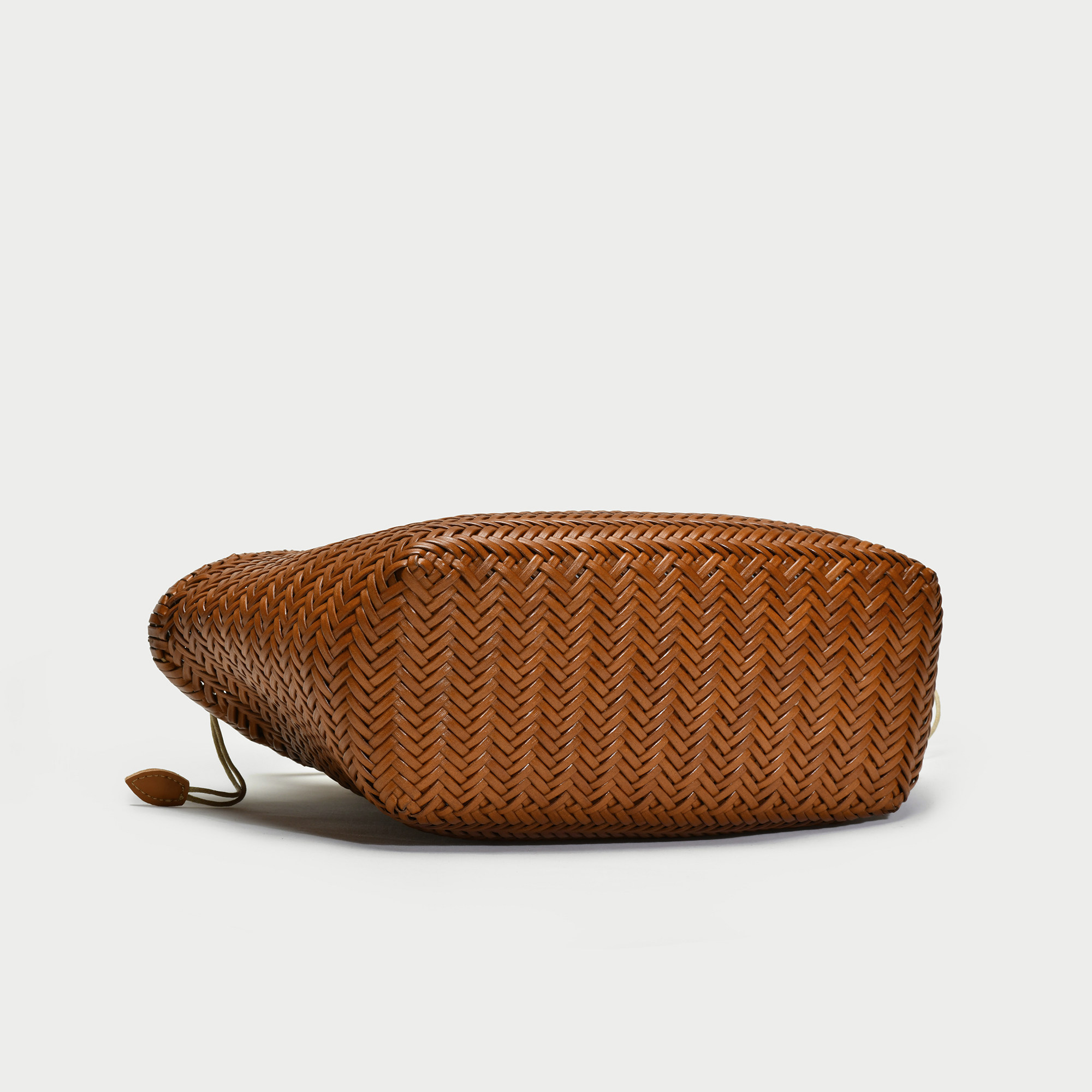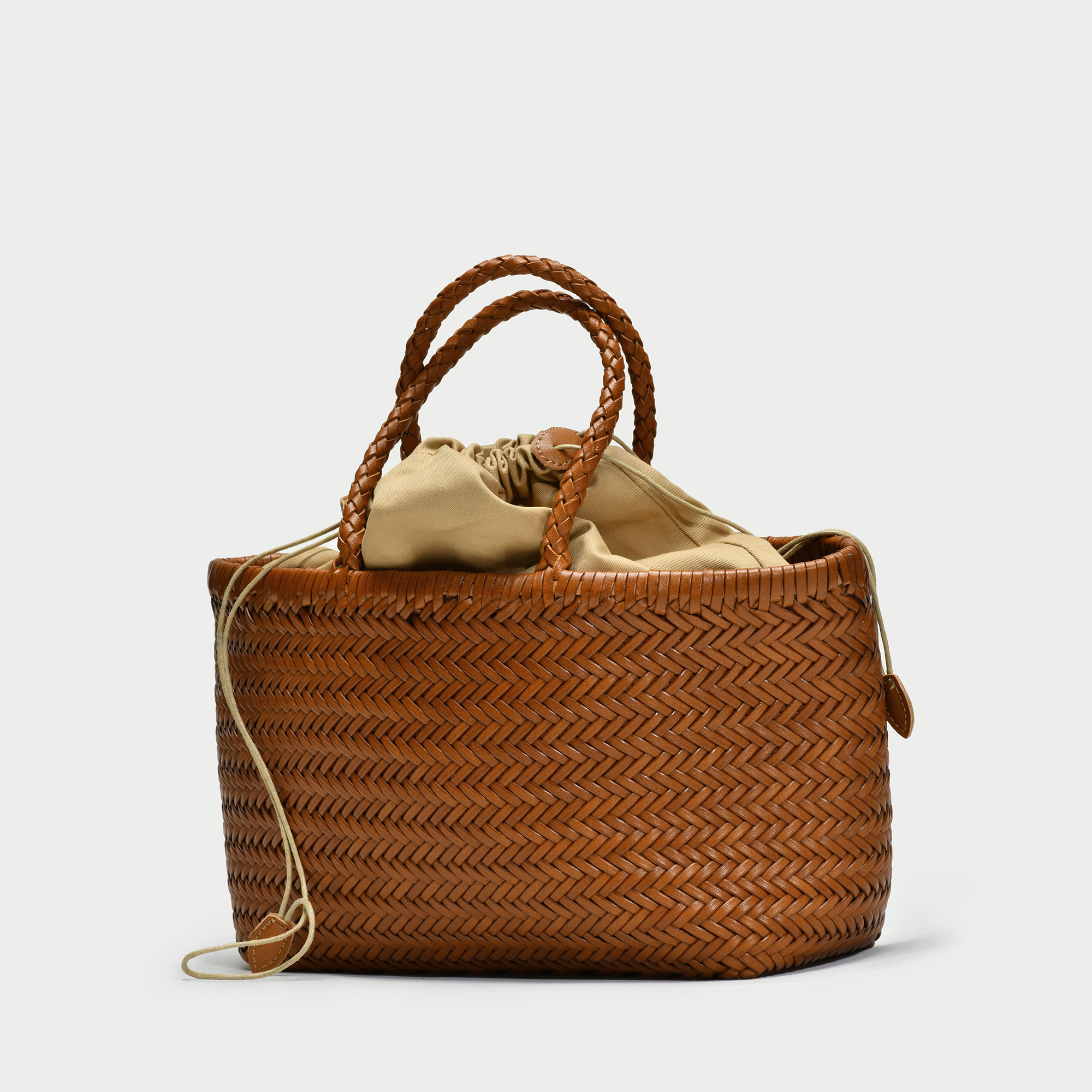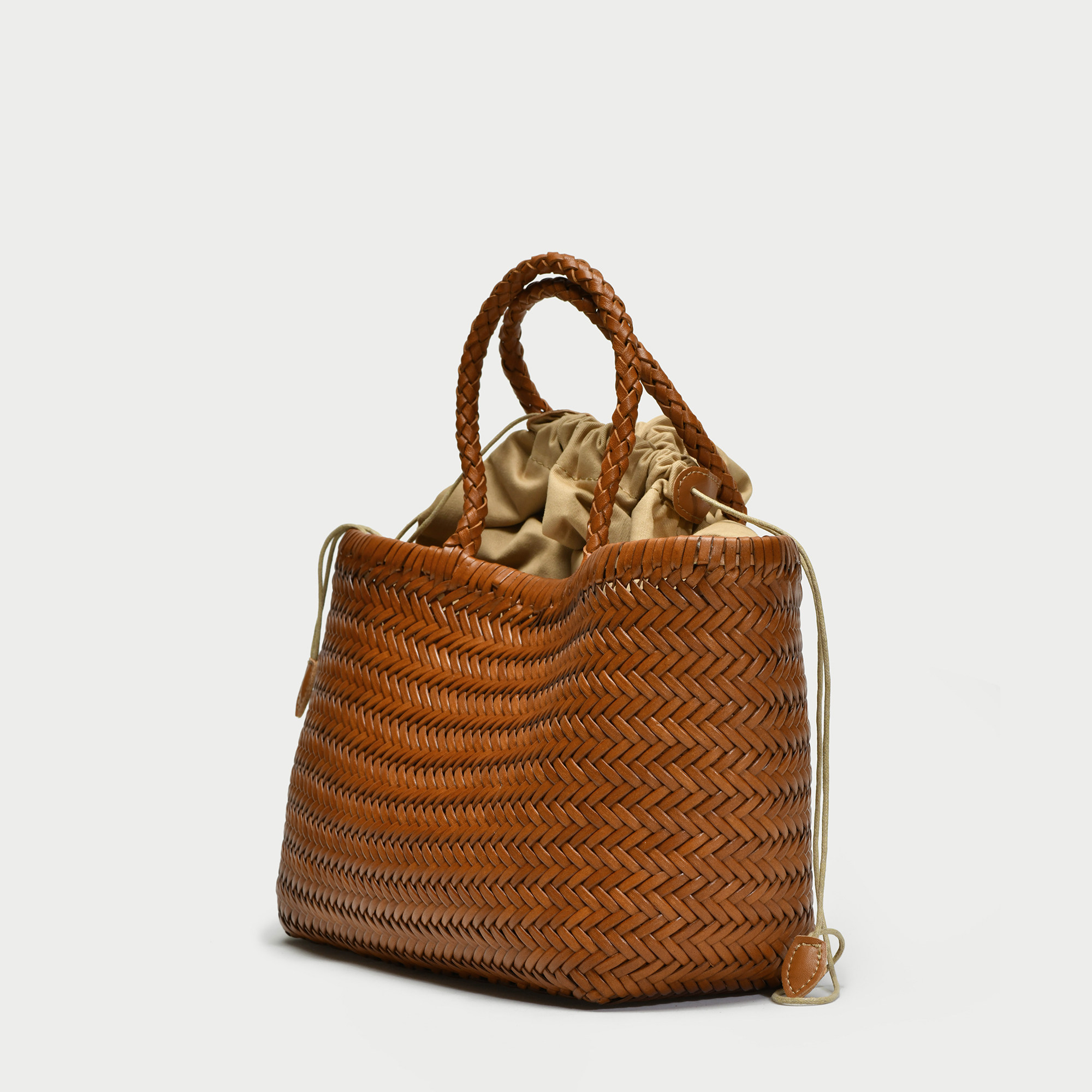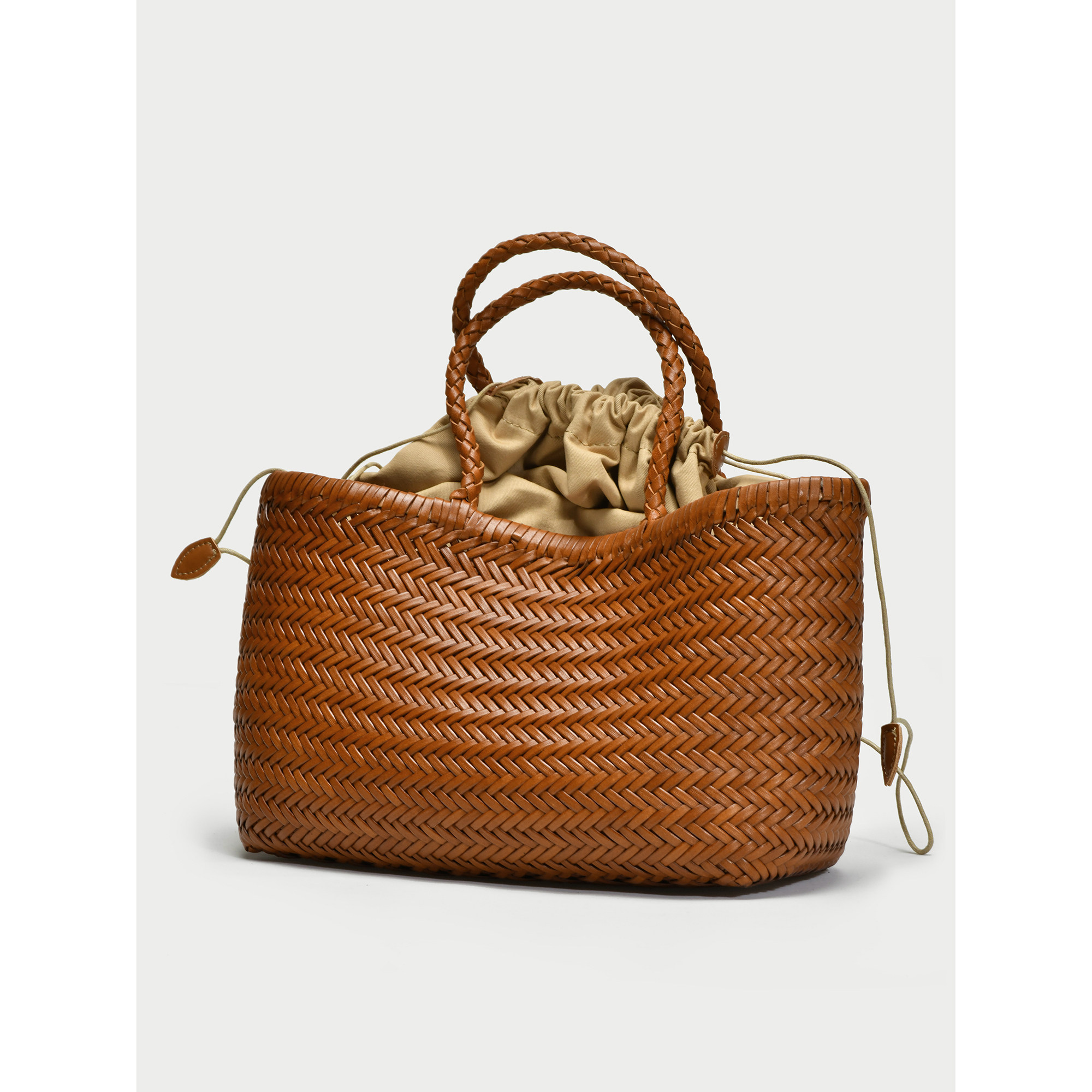 丁寧に編み込まれたレザー素材が高級感を演出し、内側の巾着が大切な荷物をしっかり守ります。
